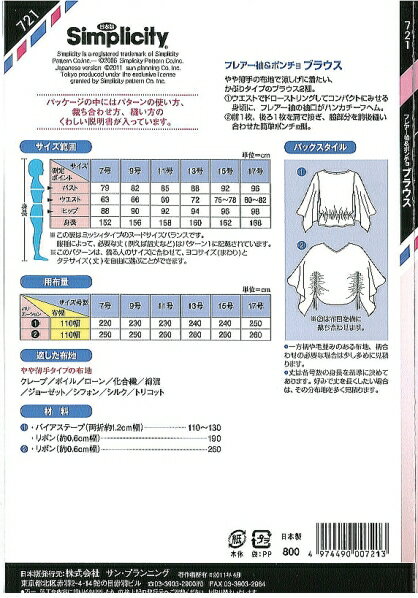 型紙 パターン フレアー袖&ポンチョブラウス No.721 シンプリシティ サンプランニング