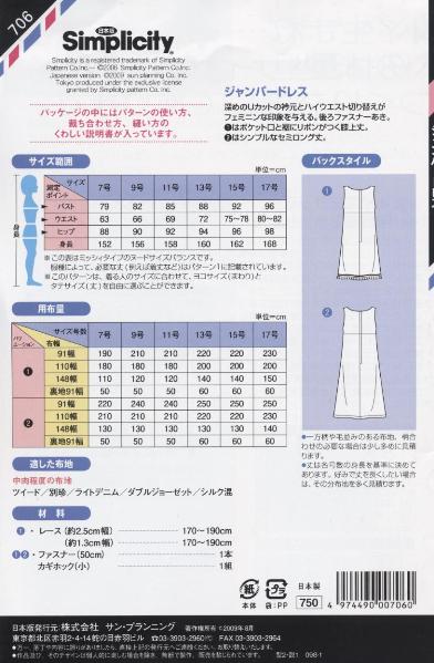 型紙 パターン ジャンパードレス No.706 シンプリシティ サンプランニング