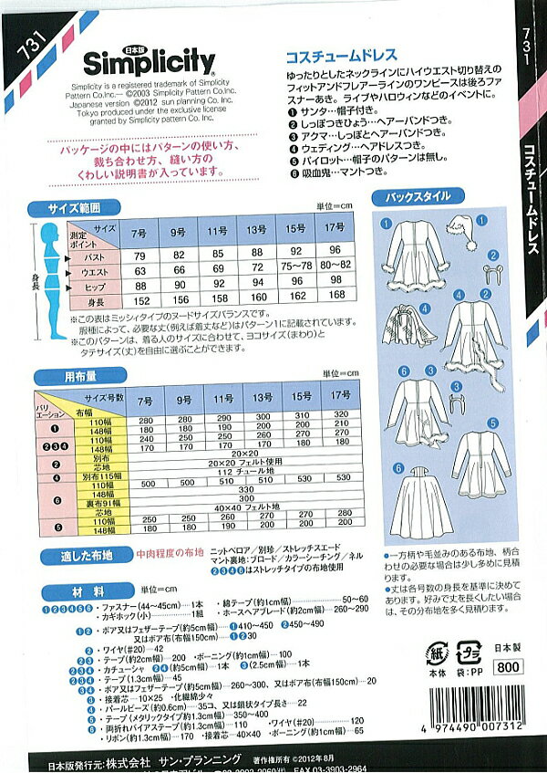 型紙 パターン コスチュームドレス No.731 シンプリシティ サンプランニング